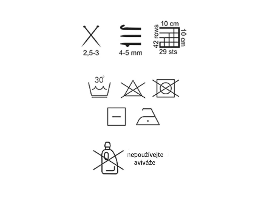 Doporučení: Pro zachování sytosti barev a struktury vlákna doporučujeme používat prací prostředky určené na vlnu. U větších ploch (svetry) je vhodné střídat dvě klubíčka po řadách, aby se vyrovnaly drobné rozdíly v ručním barvení.