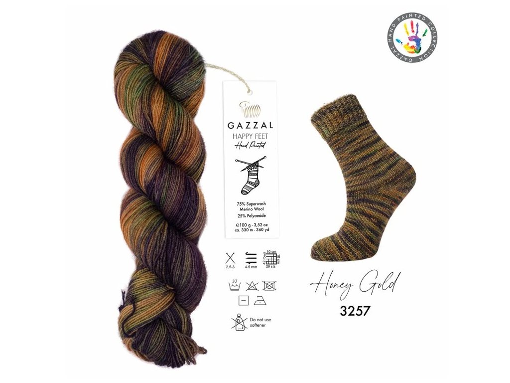 Objevte prémiovou ponožkovou přízi Gazzal Happy Feet v hřejivém a zářivém odstínu Honey Gold. Tato ručně barvená směs kombinuje termoregulační vlastnosti jemného merina s vysokou odolností polyamidu, což z ní činí ideální volbu pro pletení ponožek i výrazných módních doplňků.