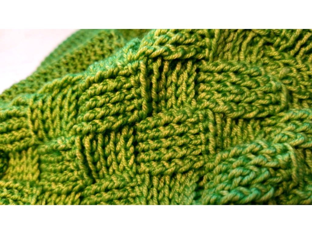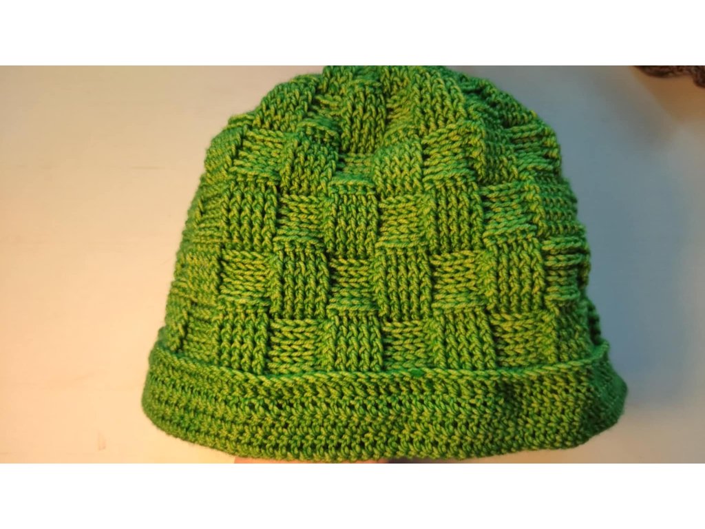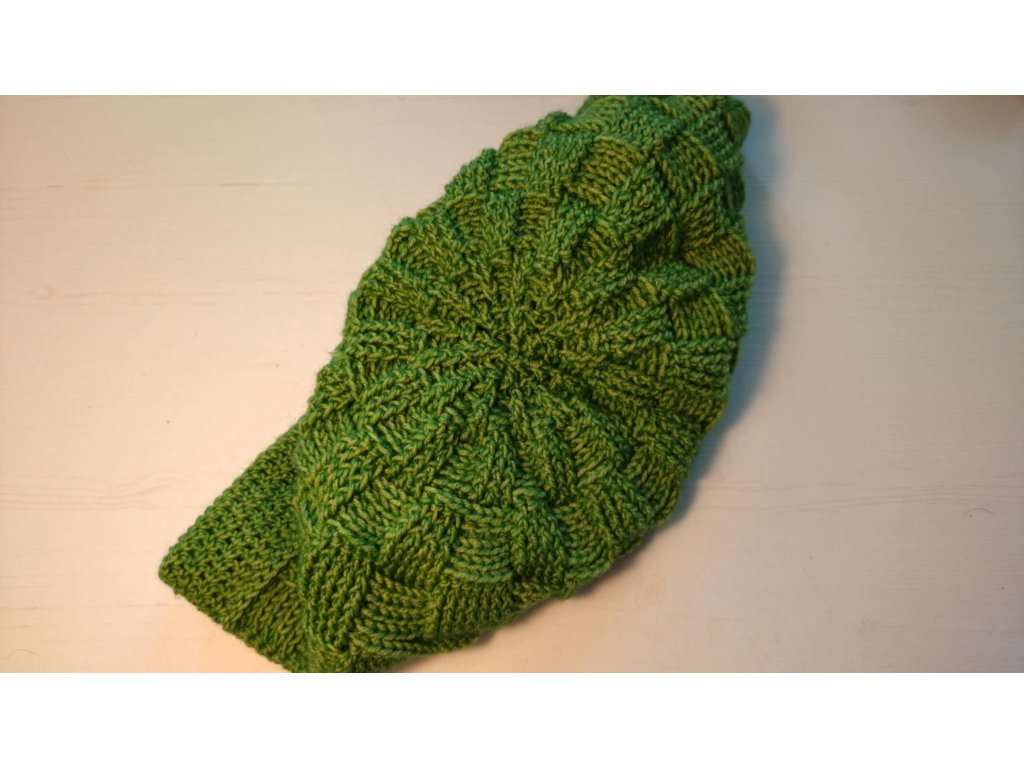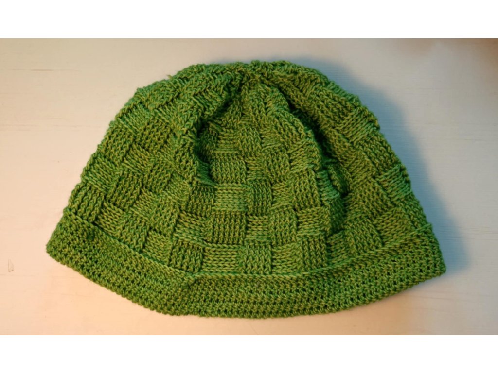 Zelená háčkovaná čepice ze 100% superwash merino vlny.