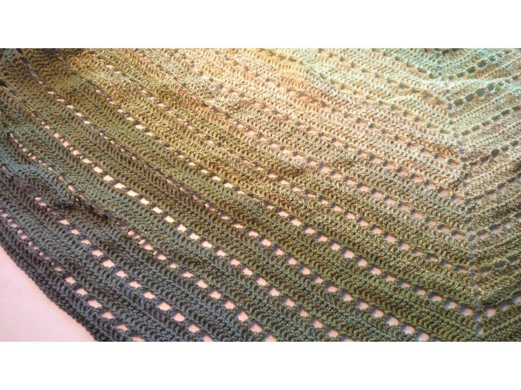 Velký trojúhelníkový šátek ze 100% bavlny v zeleném přechodu. Lehký a vzdušný díky dekorativním dírkám, příjemný na nošení po celý rok. Díky své velikosti se dá nosit na mnoho způsobů – kolem krku, přes ramena nebo jako pléd.